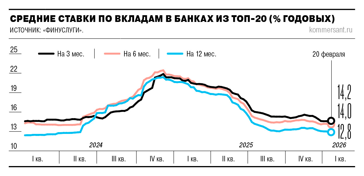 Ускоренные темпы снижения ставок по вкладам на три и шесть месяцев во многом обусловлены более высокой базой, что способствует сохранению относительно высоких ставок именно в сегменте трехмесячных вкладов. По данным «Финуслуг», именно ставки по депозитам на три месяца по состоянию на 20 февраля остались единственными, средняя ставка по которым в топ-20 банков находится выше отметки 14% годовых. При этом в среднем их уровень ниже ключевой более чем на 1 п. п. «Пик доходности по депозитам пройден. Банки и клиенты переориентируются на краткосрочные продукты, это позволяет первым гибко управлять ликвидностью на фоне снижения ключевой ставки, а вторым — фиксировать выгодные предложения»,— комментируют в ВТБ.