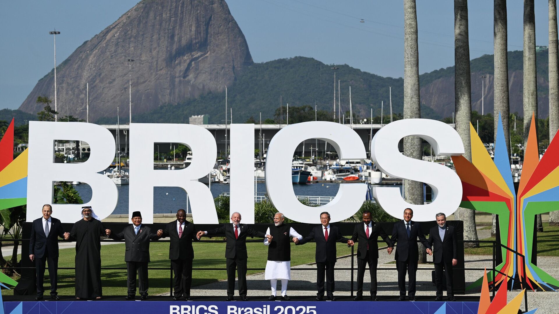 В состав БРИКС сейчас входят 10 стран: Бразилия, Россия, Индия, Китай, ЮАР, Египет, Иран, ОАЭ, Индонезия и Эфиопия.