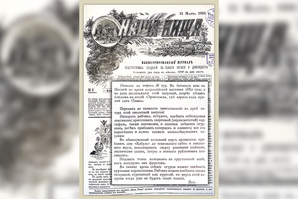 Анна Круглова: Ланспик — это желе из мясного, куриного или рыбного бульона. Надо сказать, что 1894 год на страницах журнала «Наша пища» стал бенефисом закуски Оливье, а точнее ее составляющих. В одном из последующих номеров есть подробное описание приготовления ланспика. Есть дополнение от Вебе, что в зимнее время свежие огурцы можно заменить не только корнишонами, но и огуречной травой бораго. Он уверяет, что аромат, который дают «листья этой травы, вообще в картофельном салате, а в салате Оливье в особенности, почти вполне заменяет свежие огурцы». Есть также комментарий о том, что такое соус соя «Кабуль» и от какого производителя он предпочтителен.
