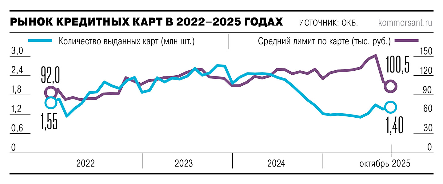 Согласно данным БКИ «Объединенное кредитное бюро» (ОКБ), в октябре сумма среднего лимита по выданным кредитным картам опустилась до 100,5 тыс. руб. Это минимум с октября 2022 года. Снижение средней суммы лимита по выданным кредиткам происходит второй месяц подряд после продолжительного роста. Так, за сентябрь—октябрь 2025 года средний лимит по кредиткам сократился на 48,7 тыс. руб. И по предварительным данным ОКБ, за ноябрь продолжил снижение, опустившись ниже 100 тыс. руб.— до 99,2 тыс. руб.